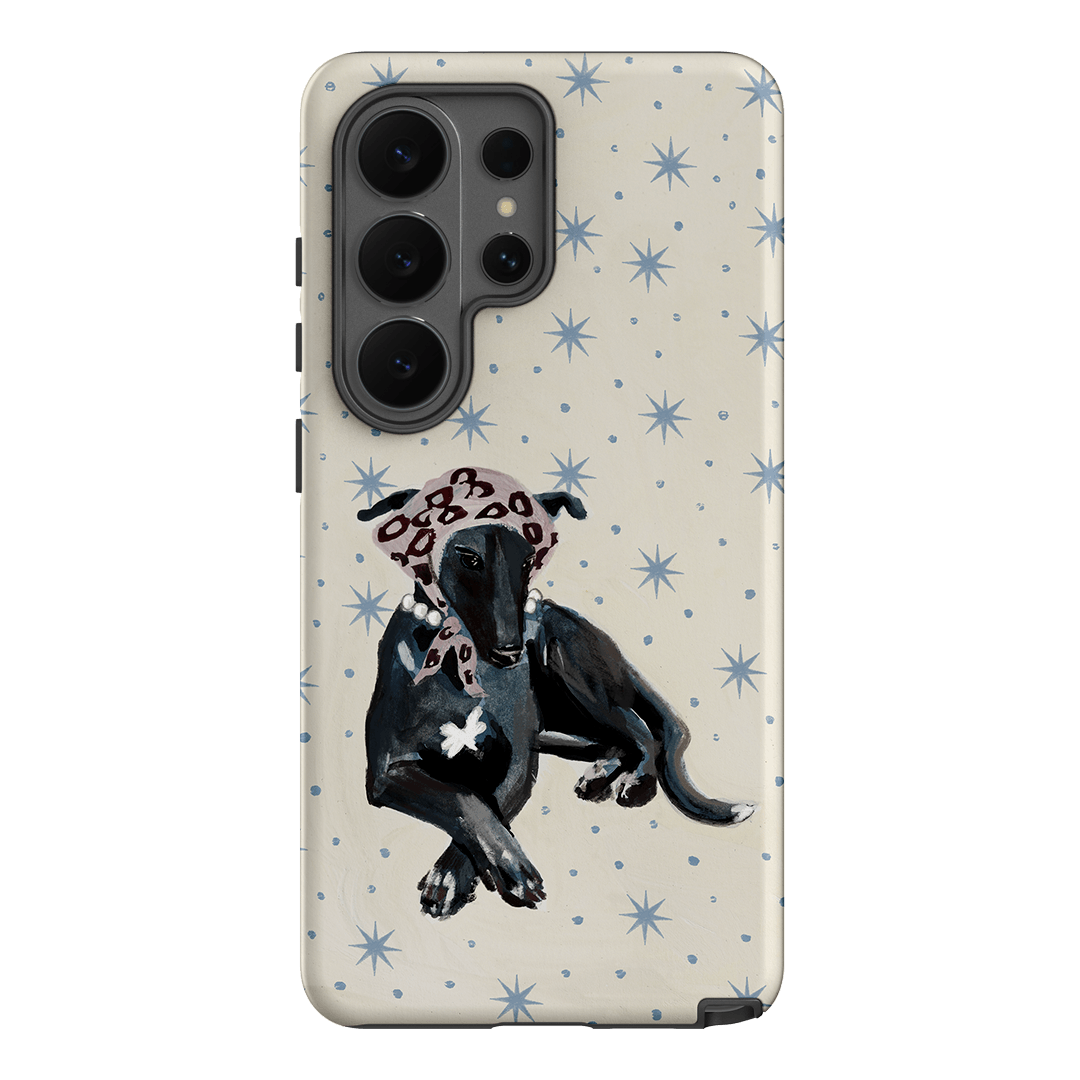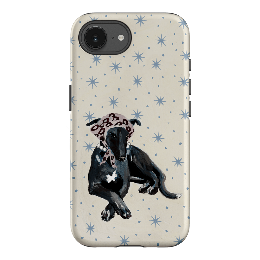 Bring retro glamour straight to your everyday scroll. This charming design stars a sophisticated greyhound lounging effortlessly against a soft cream background, sprinkled with powder-blue stars and dots for a dreamy, vintage feel. Finished with a patterned headscarf and a string of pearls, this hound is serving full Vogue editorial energy - paws and all.